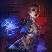 red hair, wearing armor and holding what appears to be a power or energy source in her hand. She has visible tattoos or markings on her skin and seems to be activating or controlling the energy within the sphere she holds. The style of the artwork is illustrative and dynamic, capturing a moment from the game where the character might be demonstrating combat abilities or utilizing technology commonly found in the Mass