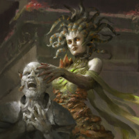 a humanoid form and her hair of living venomous snakes instead of hair. She appears to be in an underground or subterranean setting, surrounded by