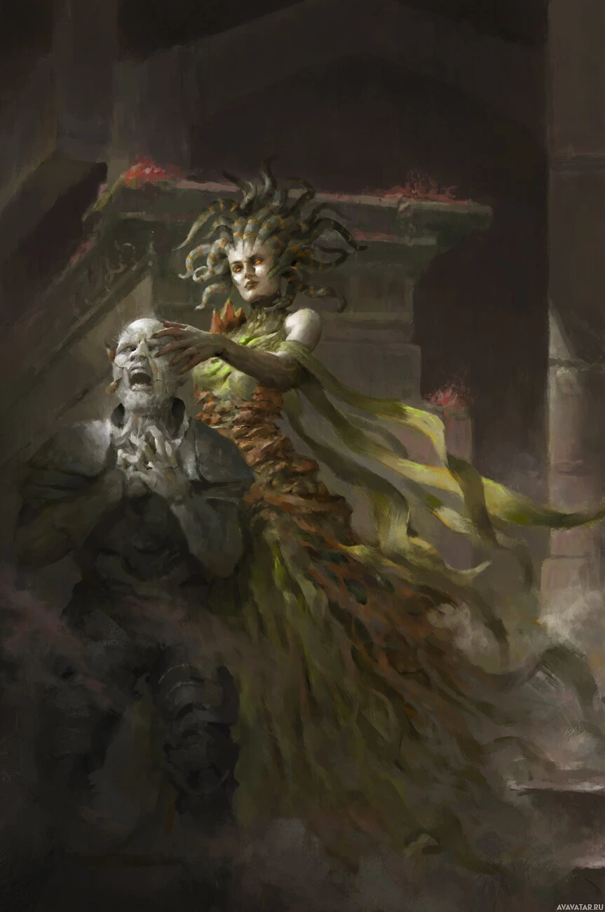 The image features a fantasy artwork that depicts Medusa, the Greek