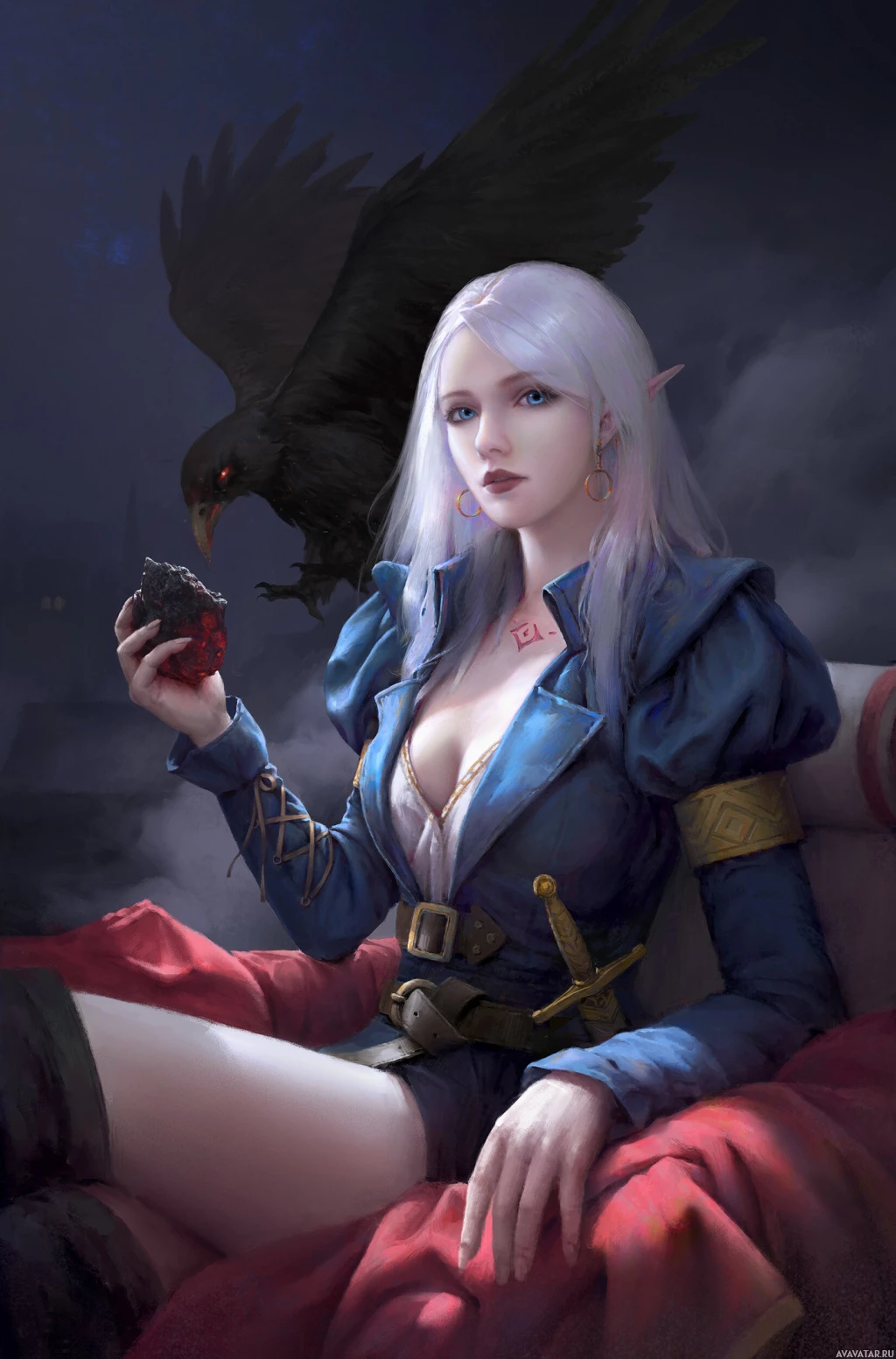 a fantasy character, who appears to be an elf with white hair. She is sitting on what looks like a throne or
