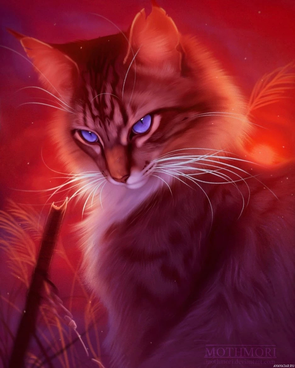 surreal colors. The cat is seated upright on what seems to be a piece of grass or a similar natural element, which adds to