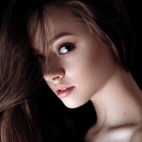 a dark background that contrasts with her light skin tone and hair color. It's a portrait style photograph focusing on her profile and upper body.