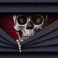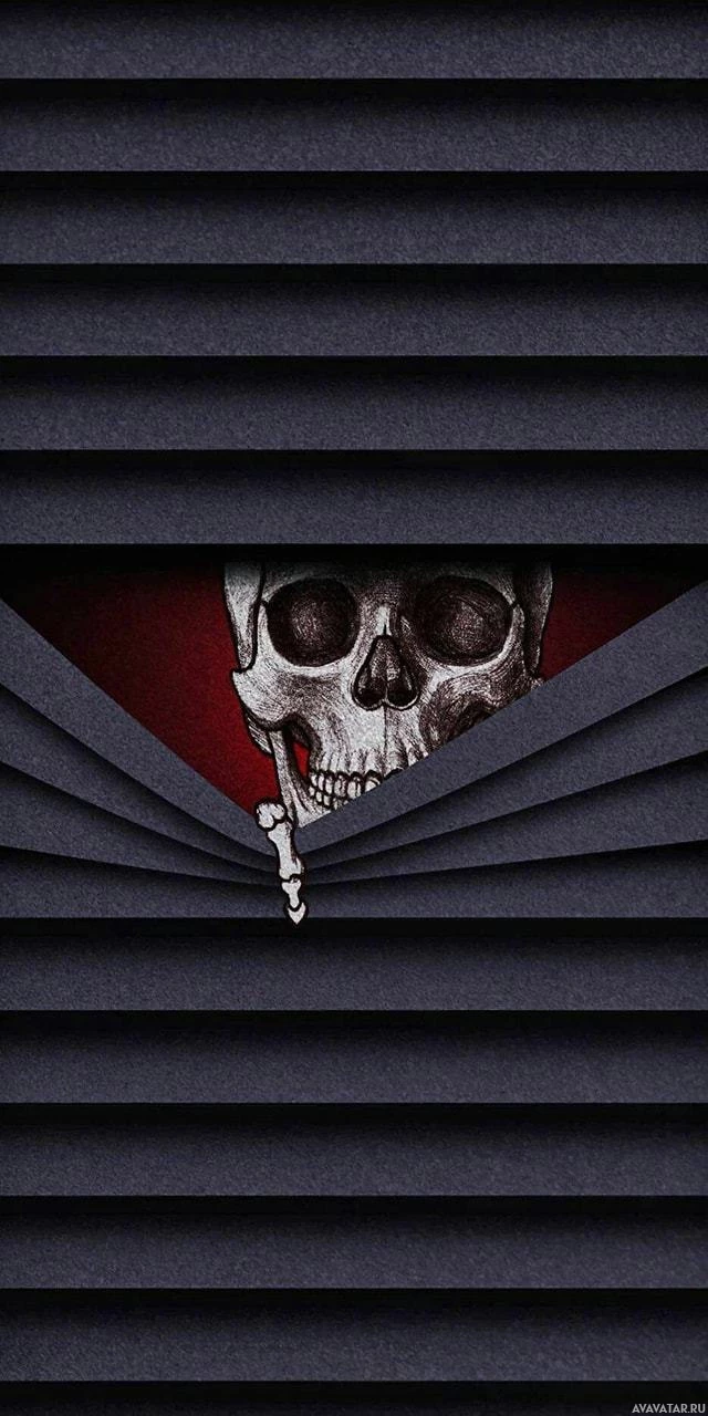 На картинке изображен череп с открытой челюстью, выглядывающий из-за чего-то, похожего на оконную штору. Фон темный, а общий тон изображения зловещий и жутковатый, что наводит на мысль о теме, связанной со смертью или ужасом.