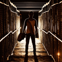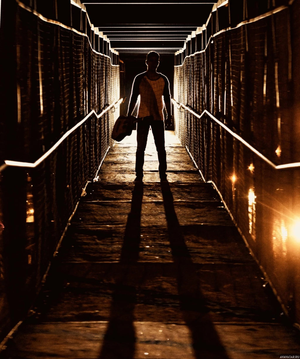 The image shows a person standing alone in what appears to be a tunnel or passageway with