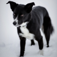 The picture shows a black and white dog standing in the snow. It appears to be looking away from the camera, possibly towards something out of frame or looking down. The background is minimalistic with a neutral tone that contrasts with the dog's dark fur and lighter