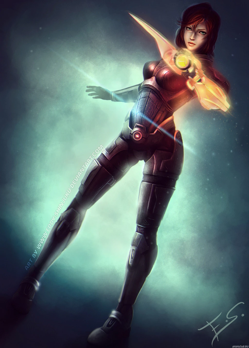 The image features a stylized character from the "Mass Effect"
