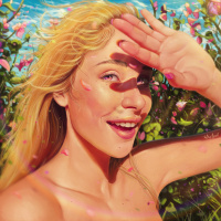 На картинке изображен персонаж женского пола со светлыми волосами, улыбающийся и поднимающий руку, как будто она прикрывает глаза от солнца. Кажется, что она находится в естественной среде, окруженная лепестками цветов, что наводит на мысль о том, что сейчас весна или лето. Выражение ее лица и жесты излучают игривую атмосферу.
