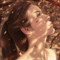 a young woman with her eyes closed, looking upwards towards the sunlight filtering through the trees. Her hair is styled in a braid and she appears to be in a serene or contemplative state. Surrounding her are fallen leaves in