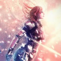 a female character wearing a suit of armor with advanced technology, which is consistent with the futuristic and high-tech aesthetic of the Mass Effect series. The background features