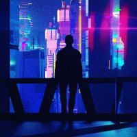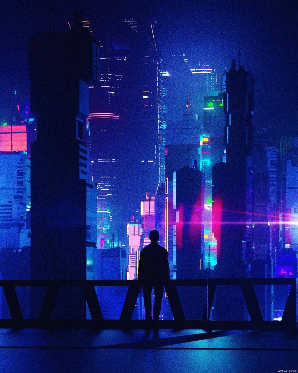 a futuristic cityscape at night. There is a silhouette of a person standing on what appears to be a balcony or platform overlooking