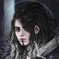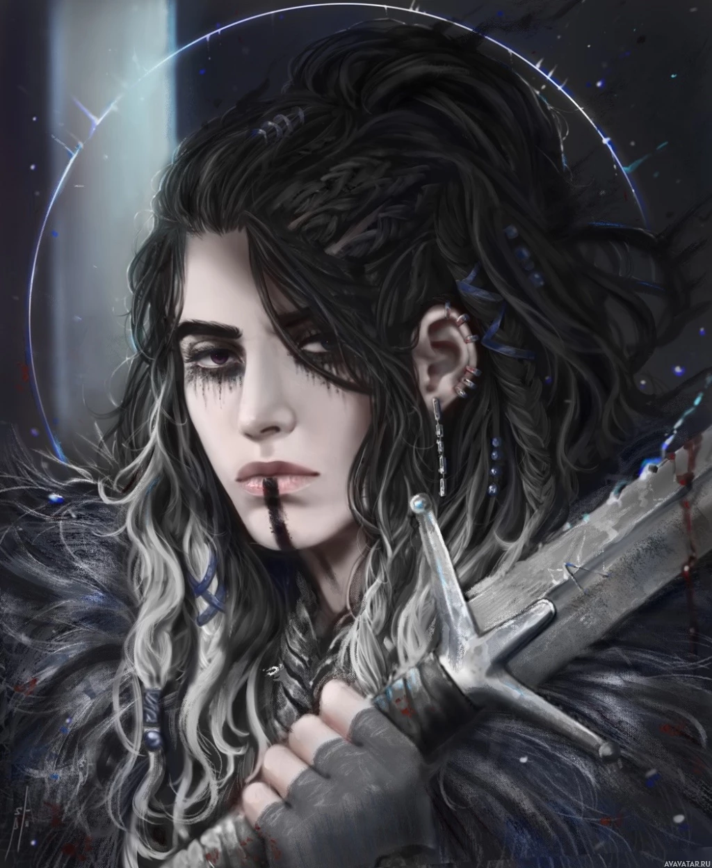 a serious expression and is wearing what appears to be armor or protective clothing, enhancing the fantasy theme.