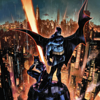 book cover featuring the characters Batman and Catwoman set in a futuristic, dystopian cityscape. The artwork showcases a dramatic and vibrant scene with both characters in their iconic costumes against a backdrop that appears to be a metropolis at night under heavy rain or possibly an alien planet with