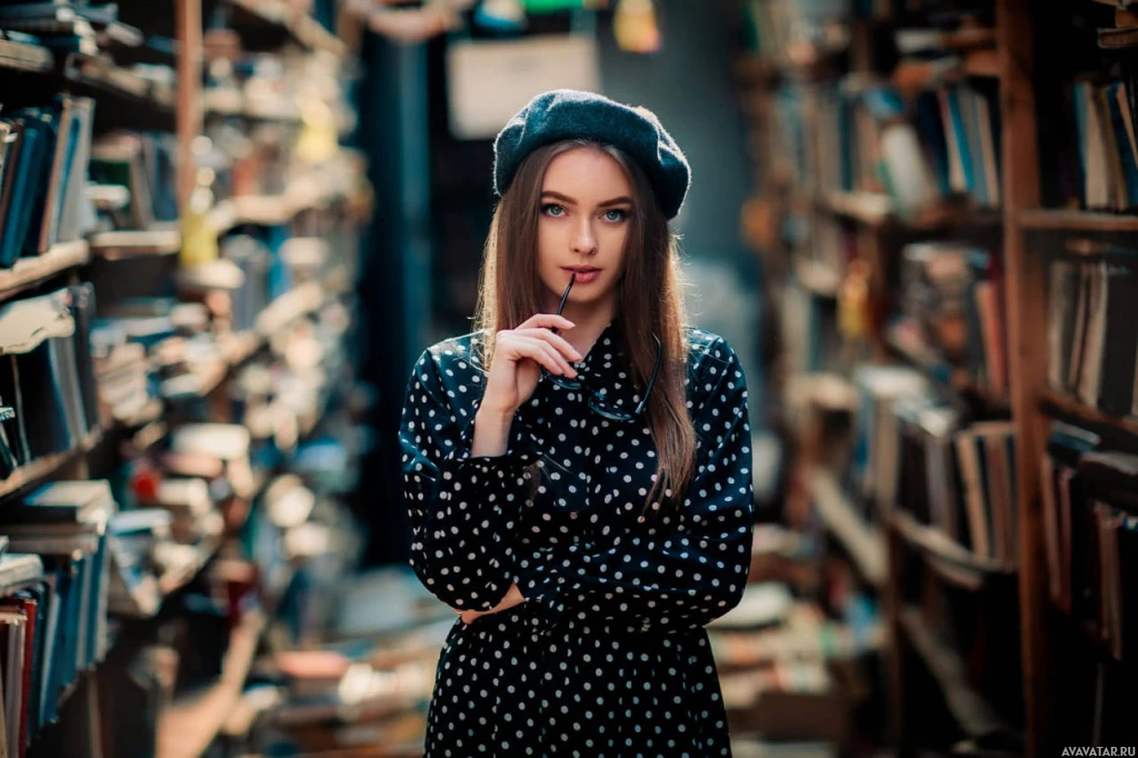 The image shows a person standing in what appears to be an old, dimly lit library or bookshop filled with books. The individual is facing away from the camera and has their hands behind their back, holding onto their elbows. They are wearing a dark top with a polka dot pattern and have