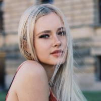 The image shows a young woman with blonde hair. She appears to be outdoors, possibly in a park or on a street, given the natural lighting and the presence of what might be grass or a garden in the background. She's wearing a casual top and seems to be posing for the photo. Her expression is relaxed and she has a slight smile on her face.