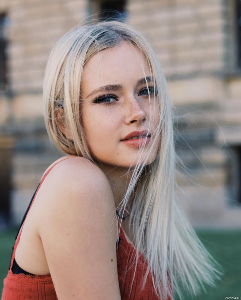 На картинке изображена молодая женщина со светлыми волосами. Судя по естественному освещению и наличию чего-то, что может быть травой или садом на заднем плане, она находится на открытом воздухе, возможно, в парке или на улице. Она одета в повседневный топ и, похоже, позирует для фотографии. Выражение ее лица расслабленное, на нем легкая улыбка.