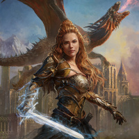 red hair, wears armor and carries a sword. Behind her stands a dragon with large wings spread out, indicating that she is likely a warrior or a character of some importance within