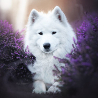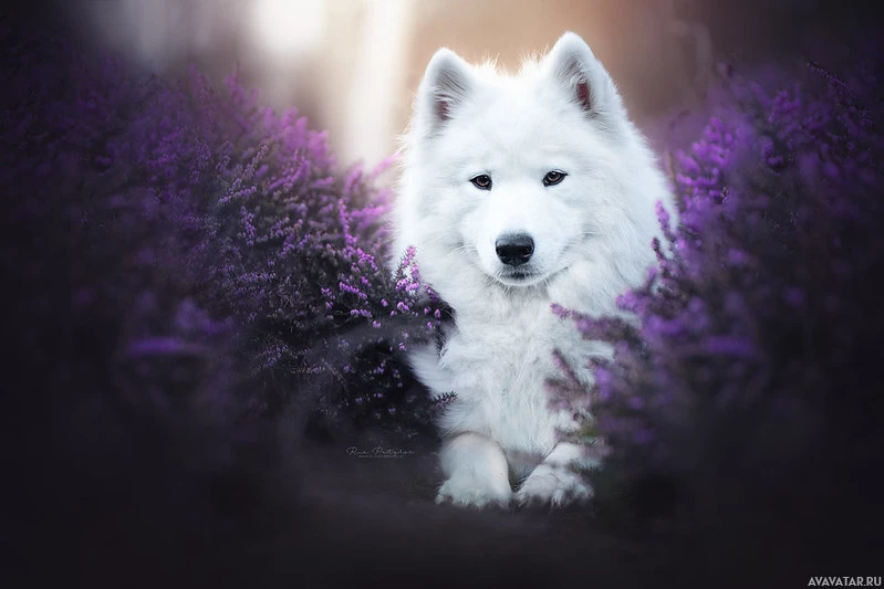 purple flowers, and there's a gentle glow that suggests either sunrise or sunset lighting. The dog has