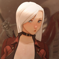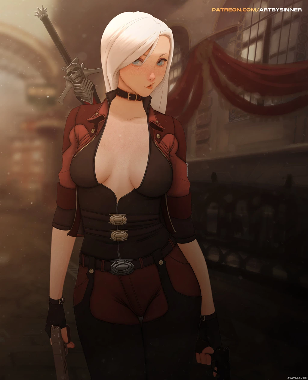 white hair. She is dressed in what appears to be a steampunk-style outfit consisting of