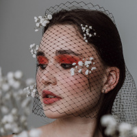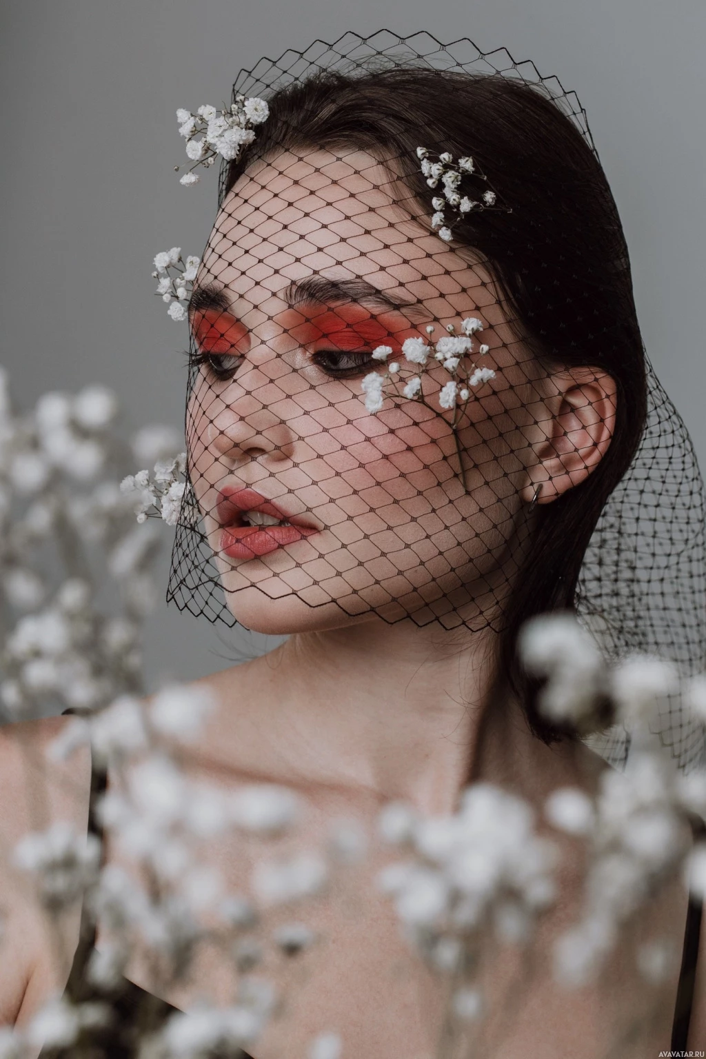 red accents on her lips and cheeks, which gives her an edgy or dramatic appearance. She has a veil draped over her head, suggesting she might be at a wedding or another