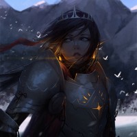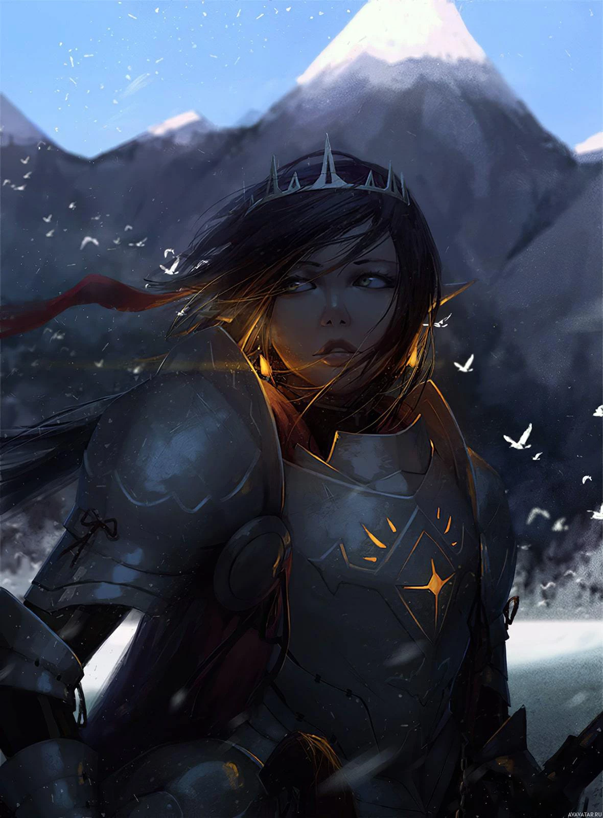 a fantasy character. The character has pointed ears characteristic of an elf and is wearing armor with a helmet that features a crown-like design on top. She has