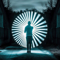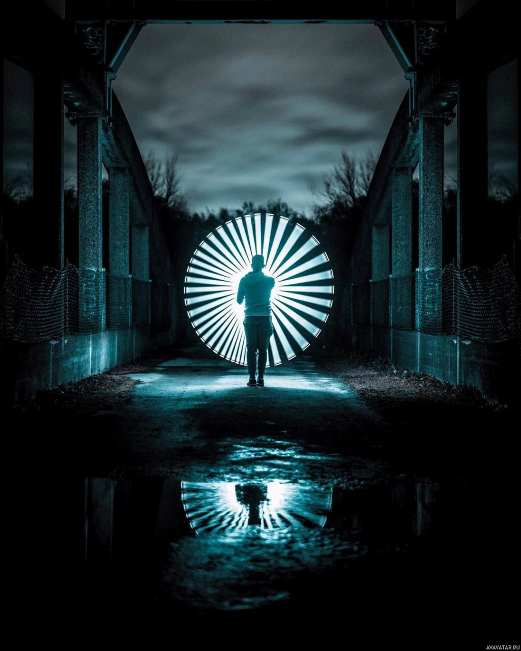 the dark sky, with their back to the camera, facing towards a circular light source that creates an artistic pattern around them. This arrangement of lights and shadows gives the image an abstract or surreal quality, enhancing