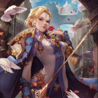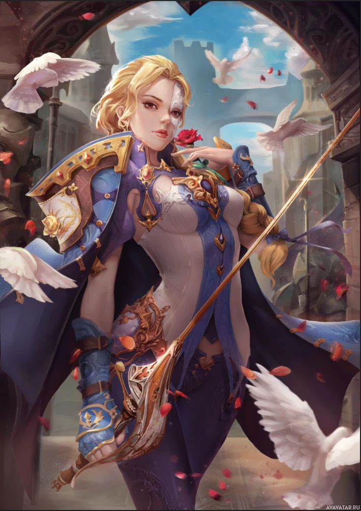 red hair, wearing a blue coat over her shoulders and holding what appears to be a staff or wand in one hand. The character also has a sword sheathed at her side. There are several pigeons around her, adding to the fantasy theme. In the background, there's an arched window with