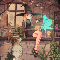an animated scene with a witch character in the foreground. She is sitting at a desk with various magical items, such as potions and spellbooks, suggesting she might be performing some sort of