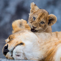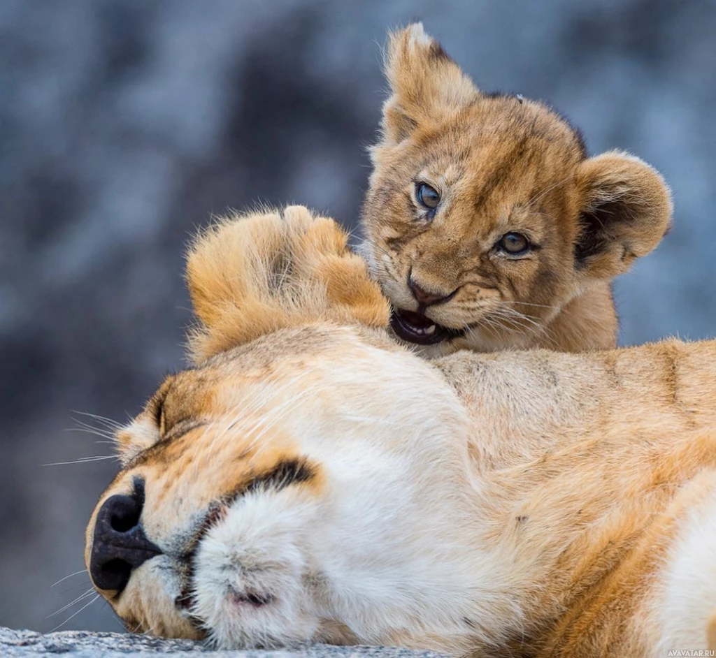 На картинке изображен молодой львенок, лежащий верхом на взрослом льве. Кажется, что львенок жует или кусает ухо взрослого, что является игривым и типичным поведением молодых львов по отношению к своим матерям или другим членам прайда. Обстановка выглядит так, как будто это могло бы быть в естественной среде обитания, возможно, в дневное время, учитывая видимость.