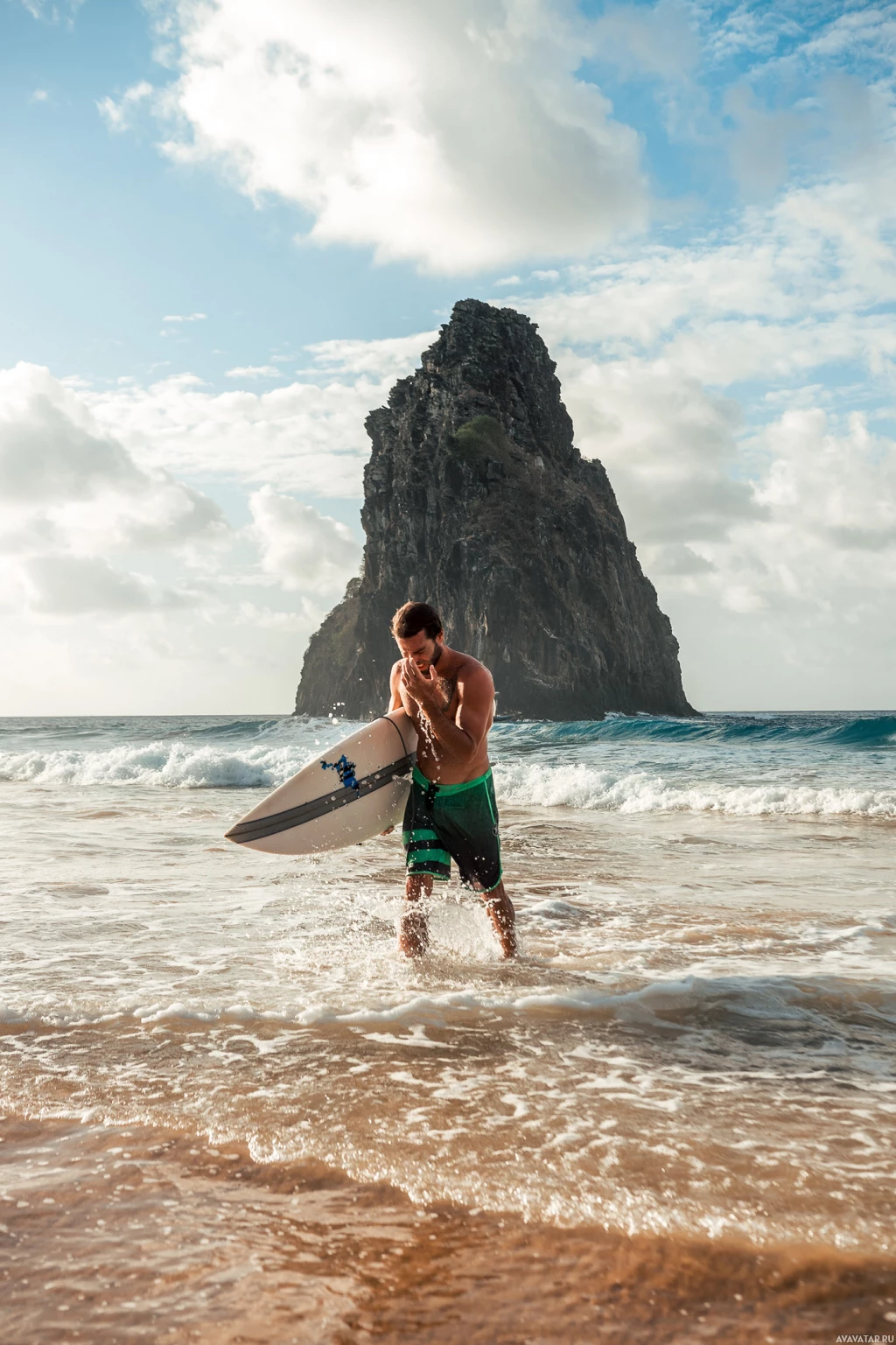 На картинке изображен человек, стоящий на берегу океанского пляжа. Этот человек держит доску для серфинга, что говорит о том, что он занимается серфингом или готовится к нему. Скалистый выступ справа указывает на изрезанную береговую линию, типичную для многих популярных мест для серфинга.