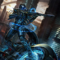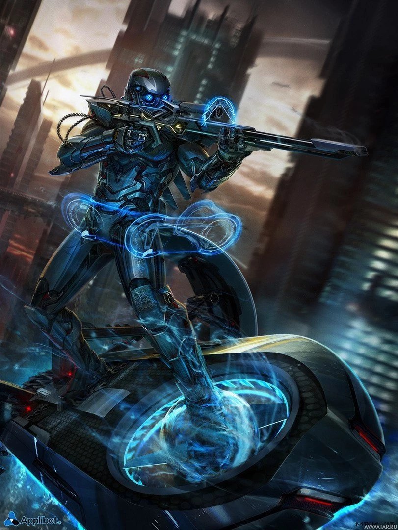 human figure riding a futuristic vehicle. This character is equipped with a weapon, which suggests that the scene might be from
