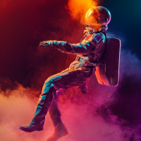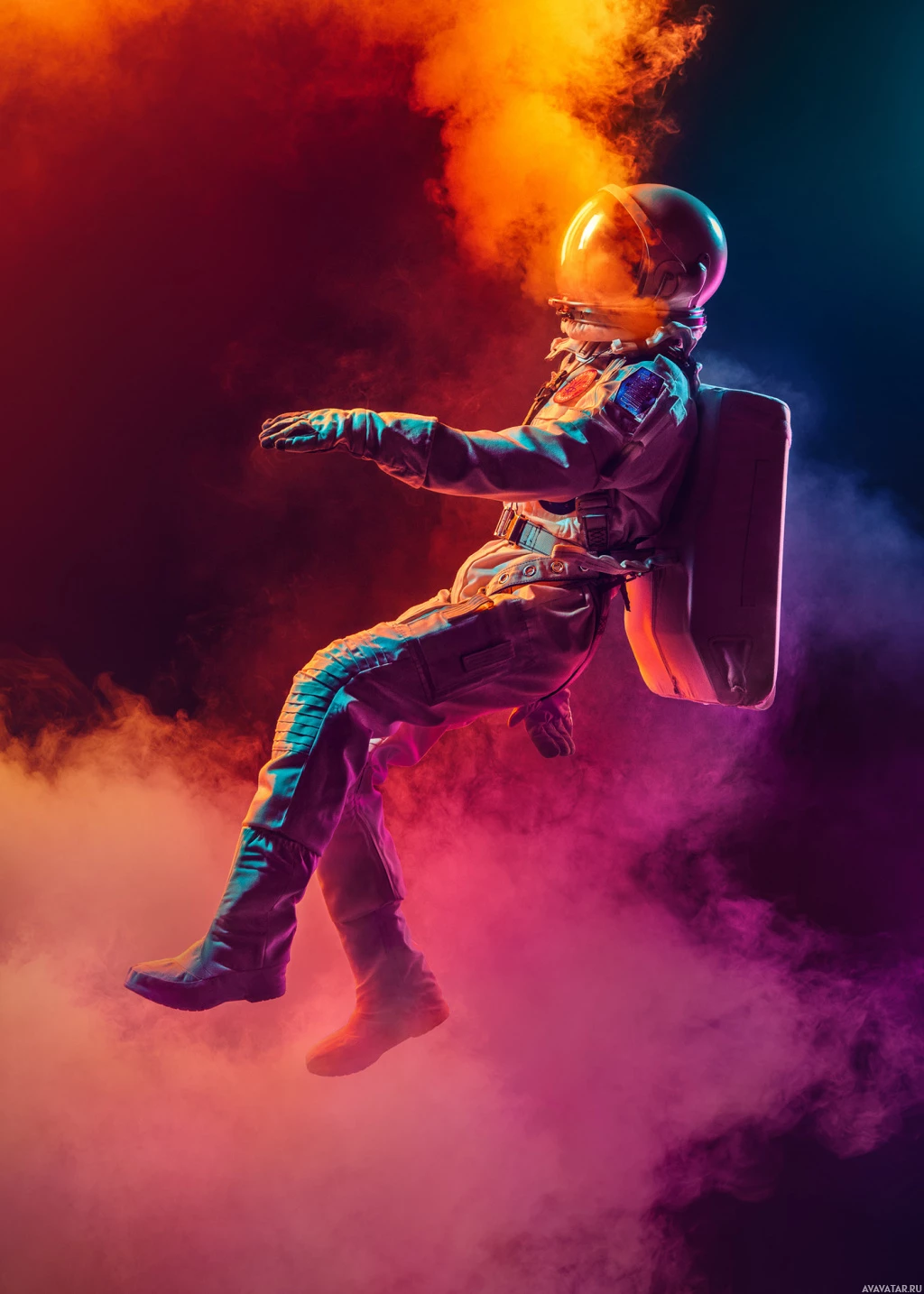 a space suit and have an oxygen tank on their back, which suggests they might be preparing for or returning from a spacewalk or extravehicular activity (EVA). The background is filled with smoke or fog effects, enhancing
