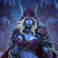 blonde hair and pointed ears, wearing an armor set that includes a cape. The character is known for her role in the game's lore and has been featured prominently across various Warcraft titles. This particular image likely represents Sylvanas in one of her more menacing or powerful moments from