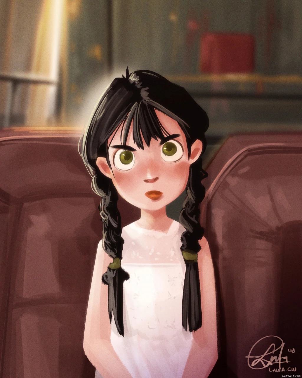 На картинке изображена анимированная девушка с удивленным или растерянным выражением лица. У нее темные волосы и одета она в белое платье. Кажется, что она сидит, возможно, в автомобиле или в комнате, учитывая нечеткий фон, который наводит на мысль о внутренней обстановке.