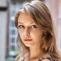 The image shows a young woman with blonde hair. She is wearing a sleeveless top and appears to be looking directly at the camera. There's an outdoor setting in the background, but there are no distinctive landmarks or objects that provide specific details about the location.
