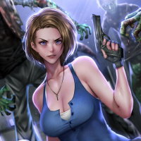 a sleeveless shirt and pants, and she has a determined expression on her face as she holds a gun in each hand. In the background, there are zombie-like creatures that appear to be attacking or chasing her. The artwork suggests a scene from