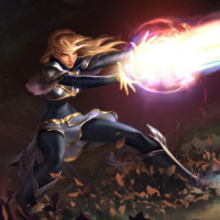 a female character with blonde hair, dressed in armor and holding a bow. She appears to be aiming or releasing an arrow from the bow, which is emitting light and energy, suggesting it may have magical properties or is part of a specialized weapon in this
