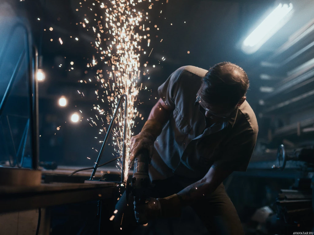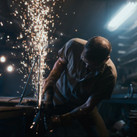 The image shows a man working with metal. He appears to be using a welding or cutting torch, as indicated by the sparks and