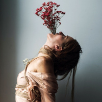 На картинке изображена женщина с запрокинутой головой, которая, по-видимому, вдыхает аромат цветов или наслаждается им. На ней элегантное платье с длинным шлейфом, который ниспадает по стене позади нее. Кажется, что ее волосы свободно развеваются, создавая ощущение движения и чувственных ощущений. Кажется, что это происходит в помещении рядом с окном или источником света в левой части изображения.