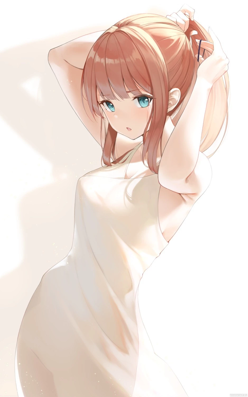 red hair, wearing what seems to be a white dress or robe. She is posed with her hand on her hip and her head slightly tilted to the side as she gazes off into the distance. The style of the artwork suggests it might be inspired by anime or manga culture.
