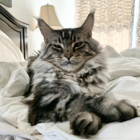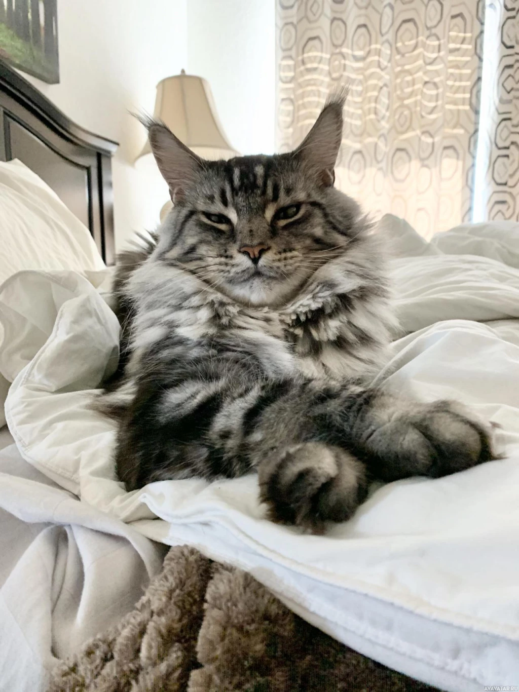 На картинке изображена кошка, лежащая на спине на кровати. Кошка выглядит расслабленной и смотрит прямо в камеру с выражением, которое может быть истолковано как легкое недомогание или раздражение, что может свидетельствовать о том, что ее потревожили во время сна. Окружающая обстановка наводит на мысль о домашней обстановке, скорее всего, в чьем-то доме.