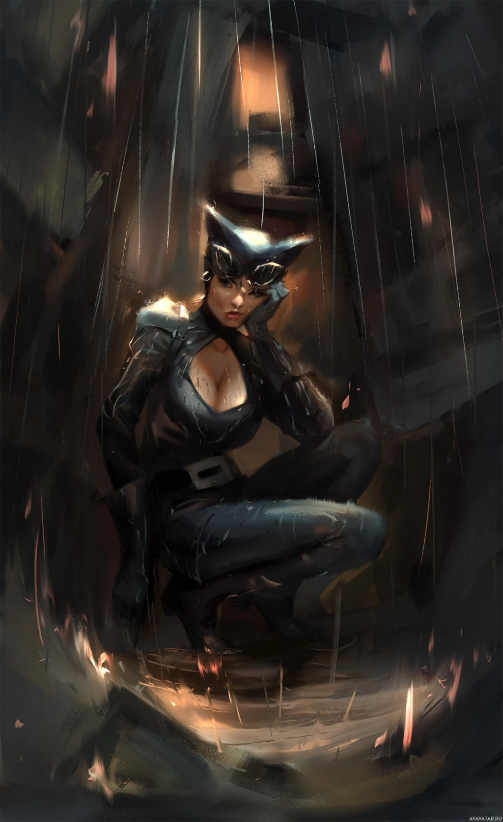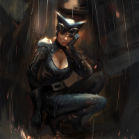 a black costume with cat-like features and she has a mask that conceals her identity. The overall atmosphere of the image is quite moody and atmospheric, suggesting a scene from