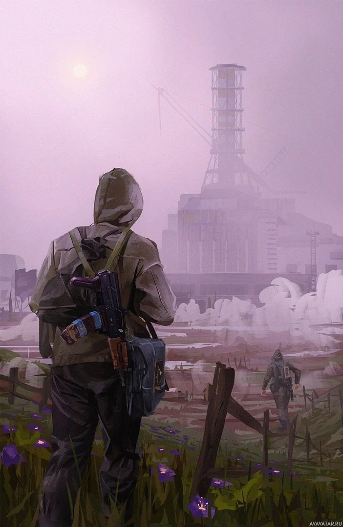 In the image, there is a character who appears to be a soldier or survivor from a game known as "Stalker." This character is standing in what looks like a post-apocalyptic or war-torn environment. The character is wearing