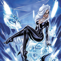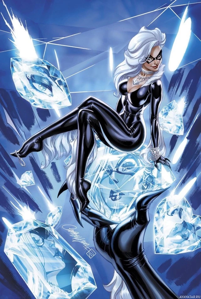 a fictional character in comic books published by Marvel Comics. She is depicted wearing her iconic black and white costume with cat-like ears, which is characteristic of the character's appearance. Her