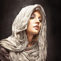 The image depicts a stylized portrait of a woman with a hood over her head. She is wearing what appears to be ancient or historical clothing, suggesting a theme related to antiquity or mythology. The woman has a serene expression and is looking directly at the viewer.