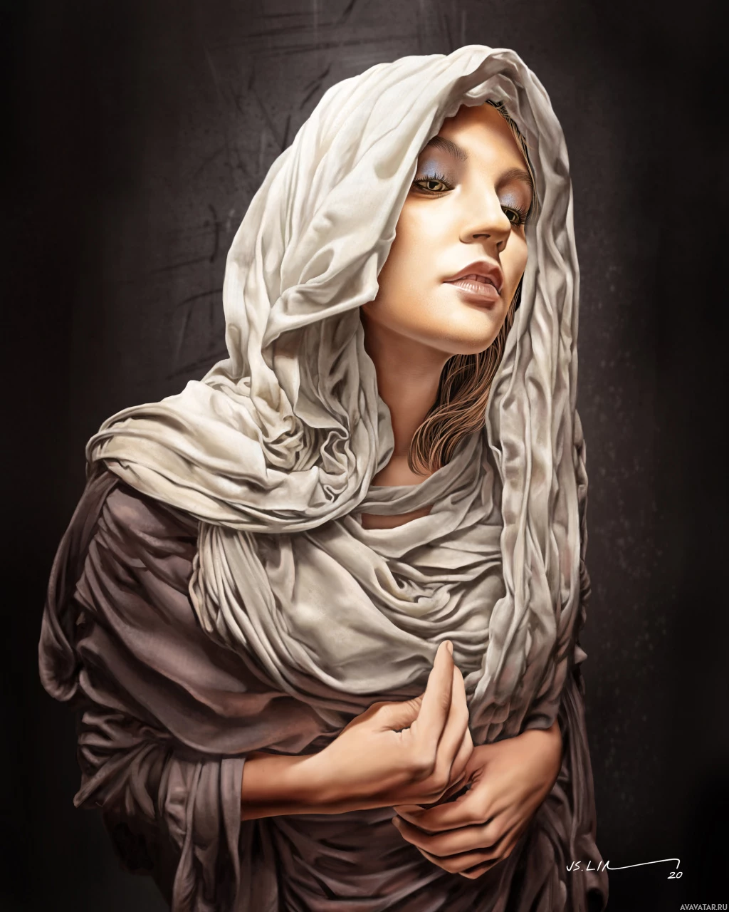 На картинке изображен стилизованный портрет женщины с капюшоном на голове. На ней надето что-то похожее на древнюю или историческую одежду, что наводит на мысль о тематике, связанной с античностью или мифологией. У женщины безмятежное выражение лица, и она смотрит прямо на зрителя.