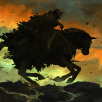 a dramatic sky. The rider appears to be wearing dark armor and has
