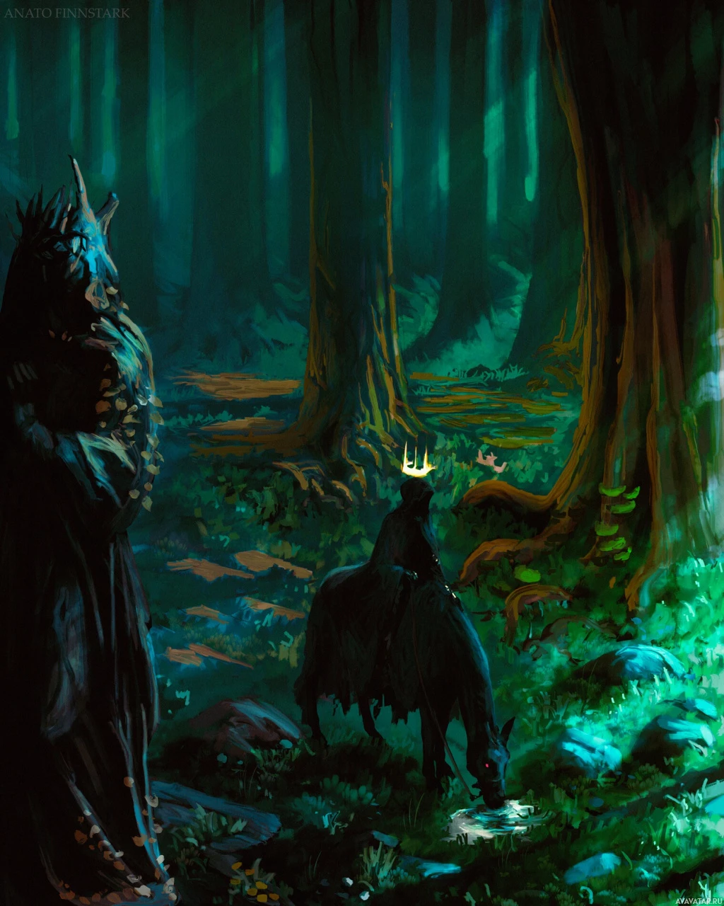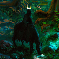 a fantasy scene set in a forest. There is an individual riding on horseback, with a crown-like headpiece on their head and what appears to be a hood or cloak over their body, giving them a mysterious or regal appearance. A character dressed in