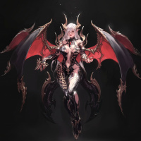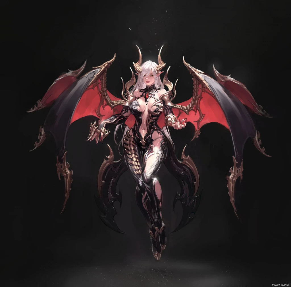 The image depicts a fantasy-themed character that appears to be a succubus. She has demonic features such as horns and wings, with