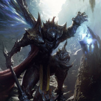 a rocky outcrop within a cave-like setting, surrounded by mystical elements such as blue energy effects and what seems to be a floating orb of light. The environment suggests a scene from