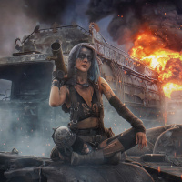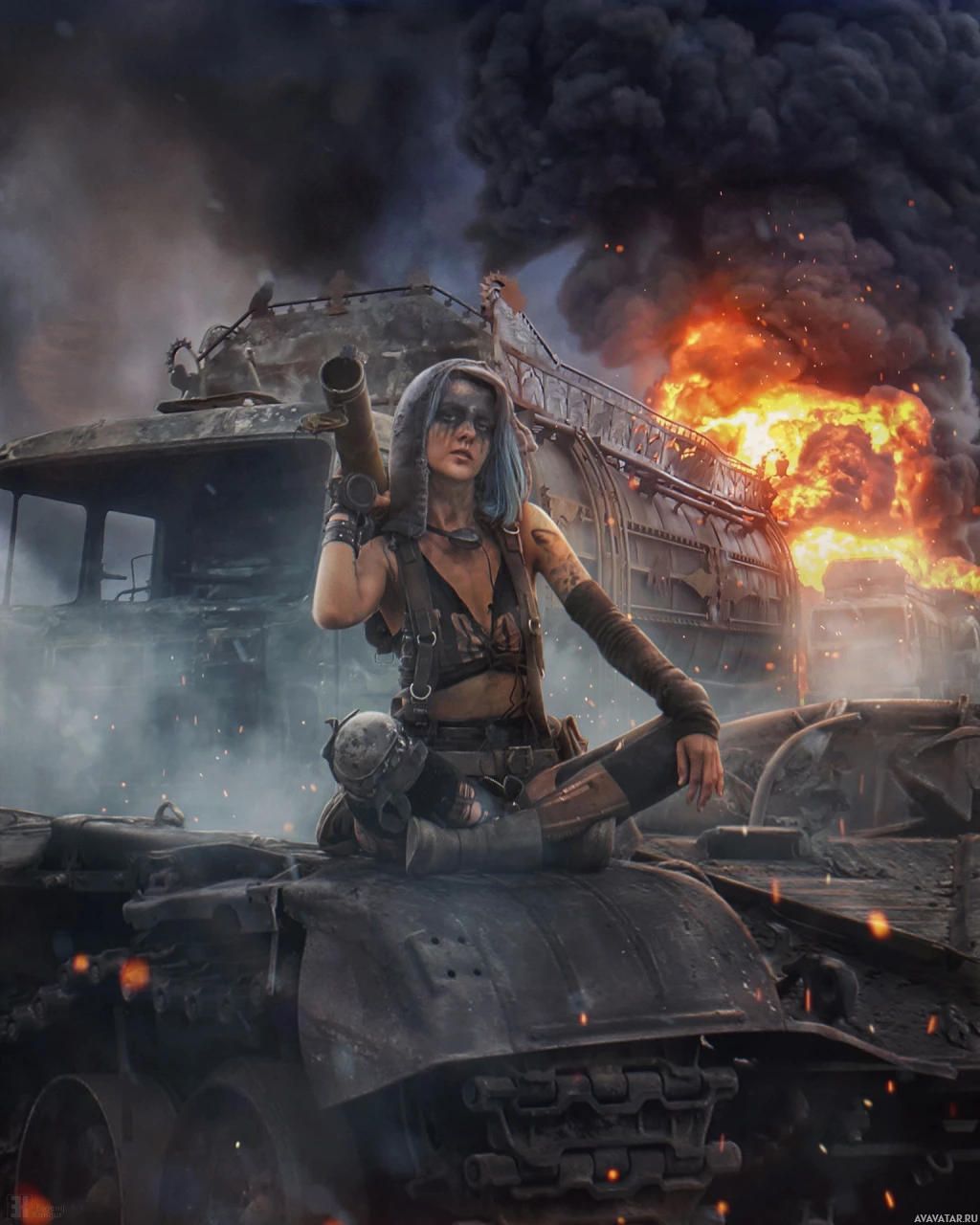explosions in the background, indicating recent combat activity or possibly an event that led to this desolate state of affairs. The girl has a fierce expression and is wearing what seems to be